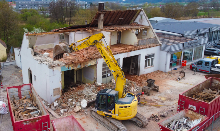 Ende März startete das neue Projekt am Autohaus Breitschwert mit den Abbrucharbeiten. Das alte Lagerhaus wird durch ein modernes neues Lagerhaus mit Sanitärbereich ersetzt.